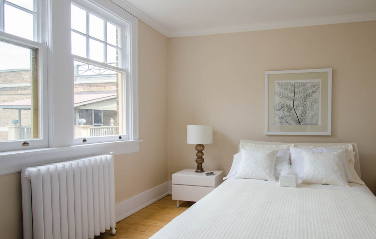High ceilings and hardwood floors are a hallmark of The Strathcona, along with large wood frame windows to let in natural light. The wide heritage mouldings are painted white, complementing plaster walls finished in a warm neutral shade.
